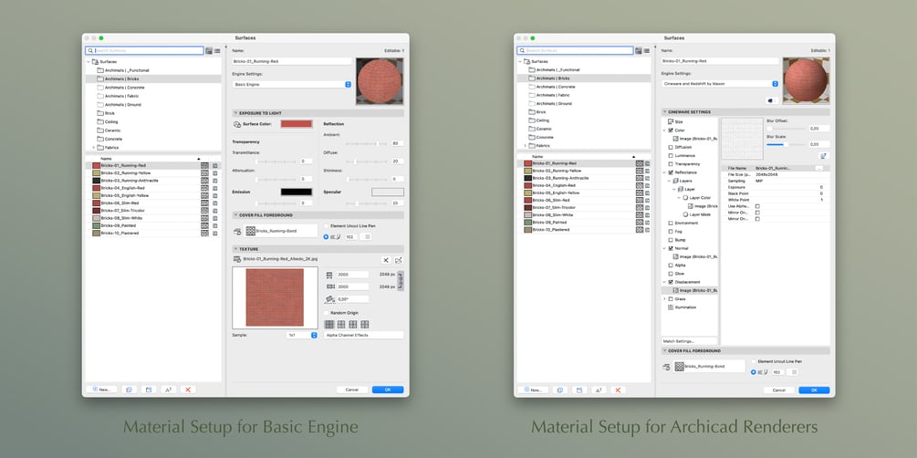 10 render-ready, seamless and carefully handcrafted brick materials for your Archicad models: these materials will look great while you design in Archicad. Whether it is for BIMx models, in app presentations or sending to other rendering apps, the pack will instantly turn your models into eye candy. The textures are accurately sized, so you don't have to worry about the scaling. Each material comes with color, normal, reflection, displacement and opacity maps configured, so you can even use them for renders inside Archicad using the Redshift or Cineware renderers.