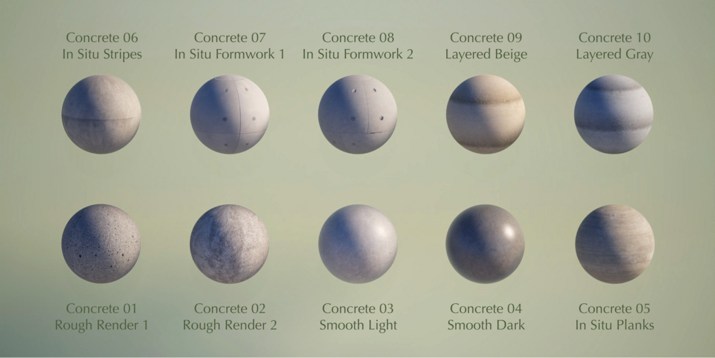 10 render-ready, seamless and carefully handcrafted concrete materials for your Archicad models: these materials will look great while you design in Archicad. Whether it is for BIMx models, in app presentations or sending to other rendering apps, the pack will instantly turn your models into eye candy. The textures are accurately sized, so you don't have to worry about the scaling. Each material comes with color, normal, reflection, displacement and opacity maps configured, so you can even use them for renders inside Archicad using the Redshift or Cineware renderers.