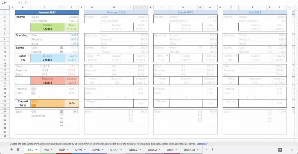 The planner comes with a total of 16 sheets: Main budgeting (Balance, Income, Expense, Savings), Graphs (Personal Expenses, Cash Flow, Savings, Annual), Data (For sorting purposes) and Utilities (Refunds, Investments, Reward, Calculator, Buy list). They are all interconnected and work together as one.