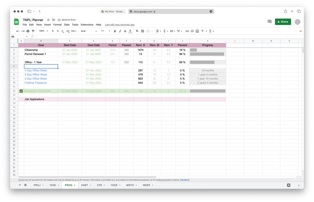 The template contains a total of 8 sheets. There are places for setting up monthly and yearly projects, tracking progess of any task, a habit tracker, and calendars of various periods.