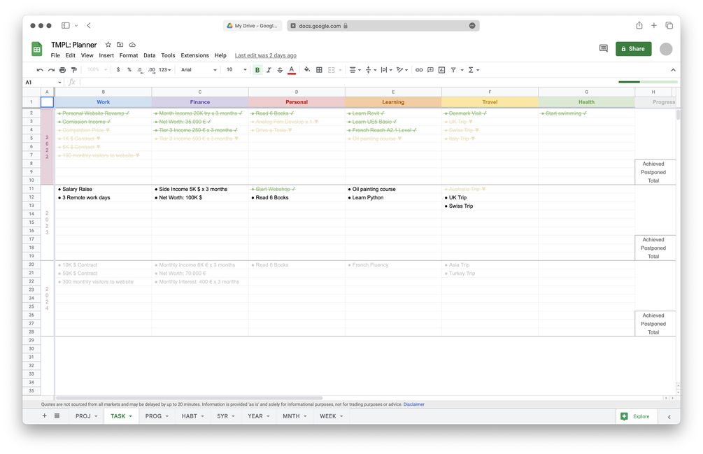 This template comes with all the necessary tools to put your life in order: calendars, task lists, goal planners and progress tracker.