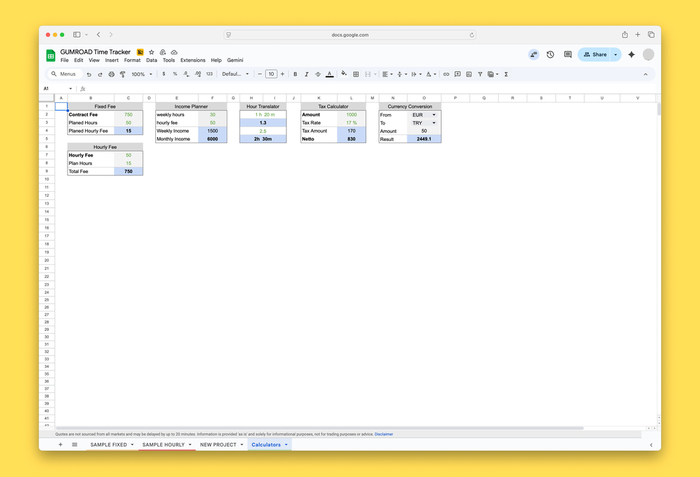 You can also use the small tools in the calculators sheet to calculate contract prices when giving offers to clients, or plan your monthly income based on your average monthly work.