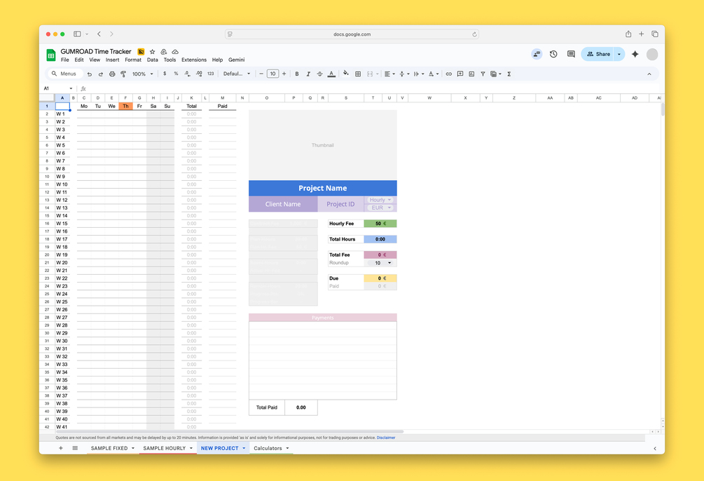 Keep track of the times you work for your projects with this simple Google Sheet template. No subscriptions: pay once and use it forever.