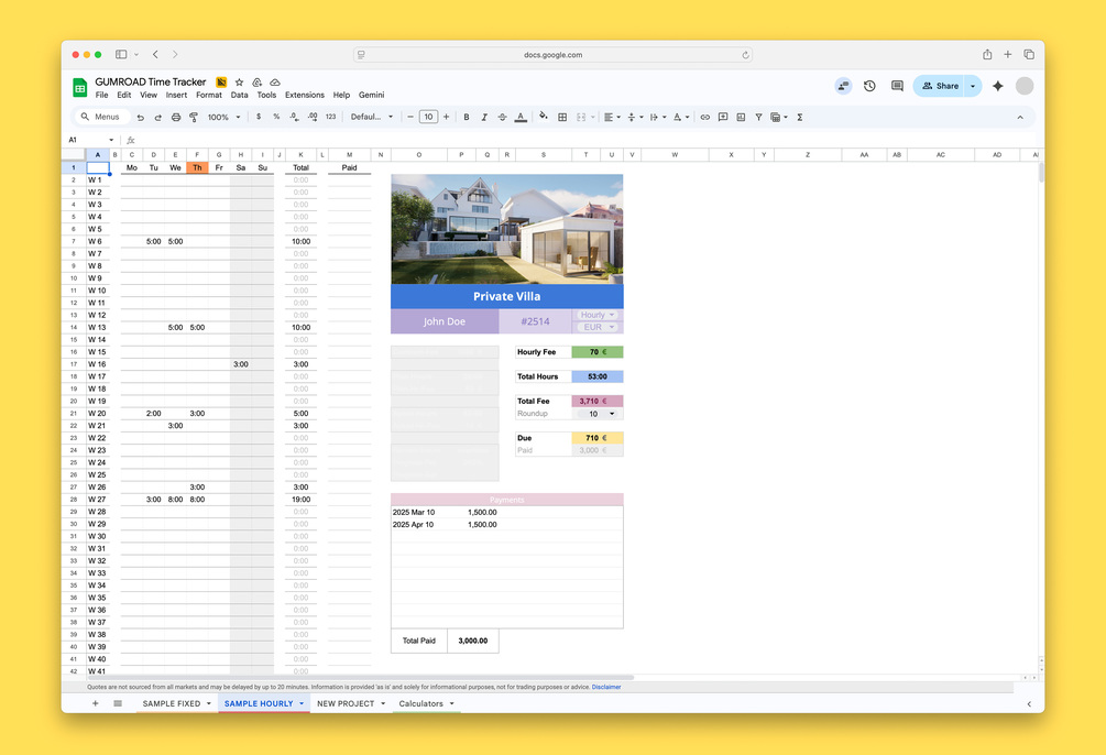 You can also use the small tools in the calculators sheet to calculate contract prices when giving offers to clients, or plan your monthly income based on your average monthly work.